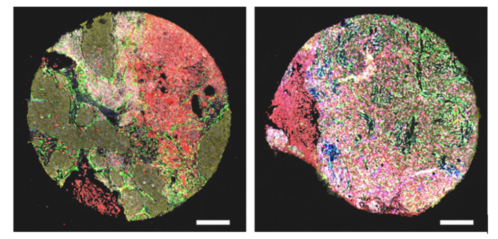’m writing to you from the Biomedicum, a research facility at the University of Helsinki. As you can probably guess, I didn’t travel here for the Finnish weather, but to collaborate with a team that is part of the European Mac4Me consortium. This group specialises in a fascinating imaging technique called multiplex immunohistochemistry. In simple terms, they take patient tissue samples or samples created in the lab and cut them into incredibly thin slices—just 4 micrometres thick, which is about 4/100ths of a millimetre. They then use multiple rounds of staining with antibodies to visualise different tumour markers and map out exactly where these markers are located within the sample. You can see an example of this stained tissue below.