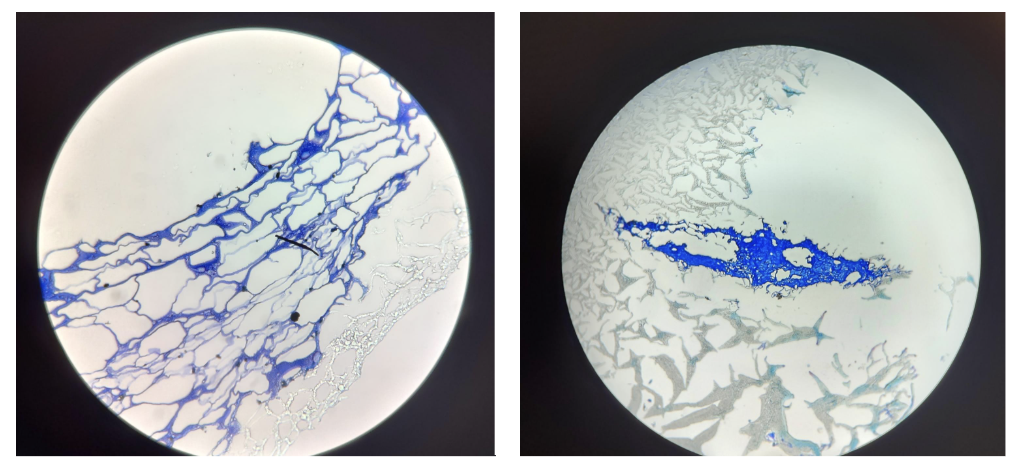 For this project, I brought along different versions of a “brain-like” hydrogel I’ve created in the lab. These hydrogels have varying stiffness and molecular compositions, and they contain Neuroblastoma tumour cells growing within them (you can see simple cell staining below). My goal here is to use the lab’s advanced imaging machine to observe how these tumour cells behave. I want to see if they are multiplying, if they seem stressed or healthy, and how they adapt to the different molecular environments of the hydrogels.